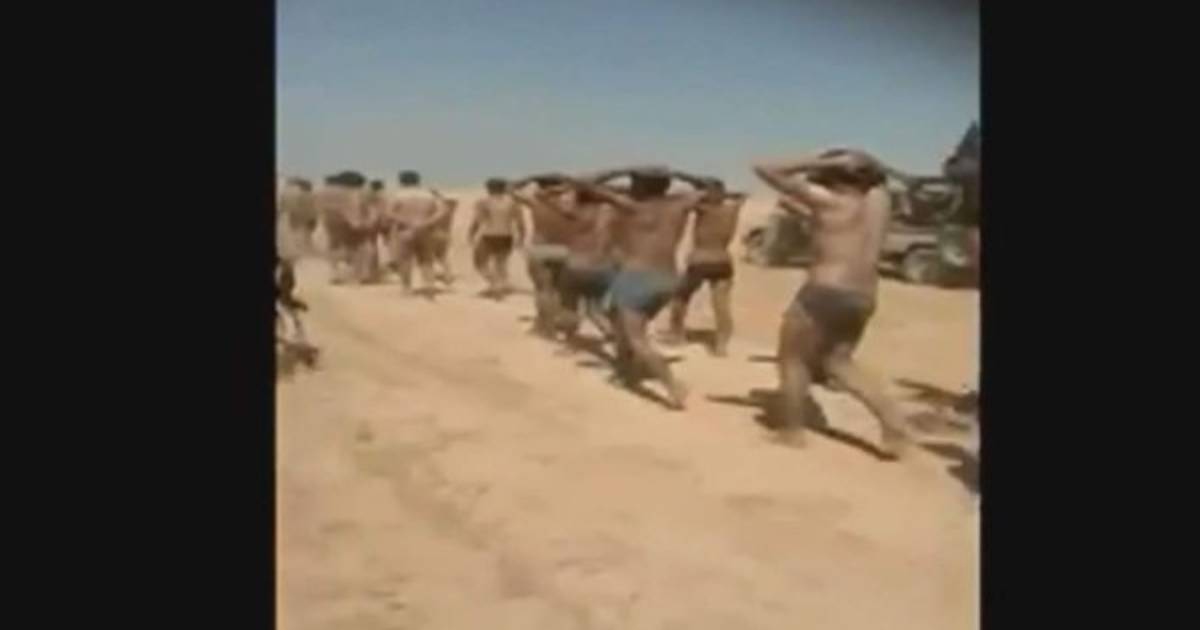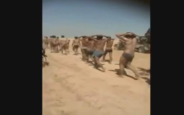 En las primeras imágenes, decenas de jóvenes caminan sobre una carretera en ropa interior, descalzos, con las manos sobre la cabeza, rodeados por yihadistas armados, uno de los cuales lleva un estandarte del EI.