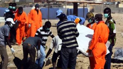 Luego, tras un primer plano en el que se ven varios cuerpos apilados, la cámara filma un poco más lejos una larga fila de cadáveres boca abajo en el suelo. Unos 10 hombres, que parecen ser habitantes de la región, los miran.