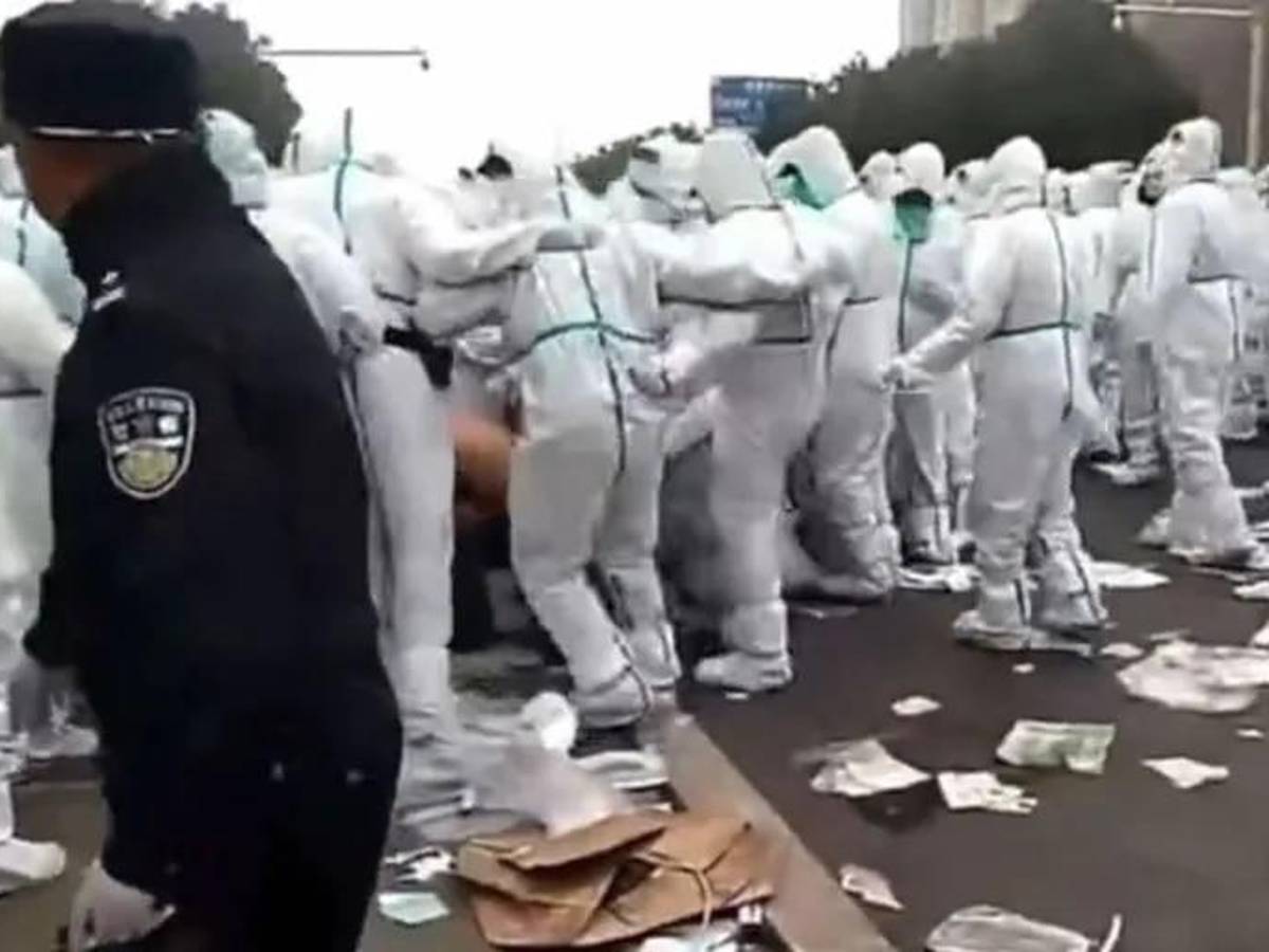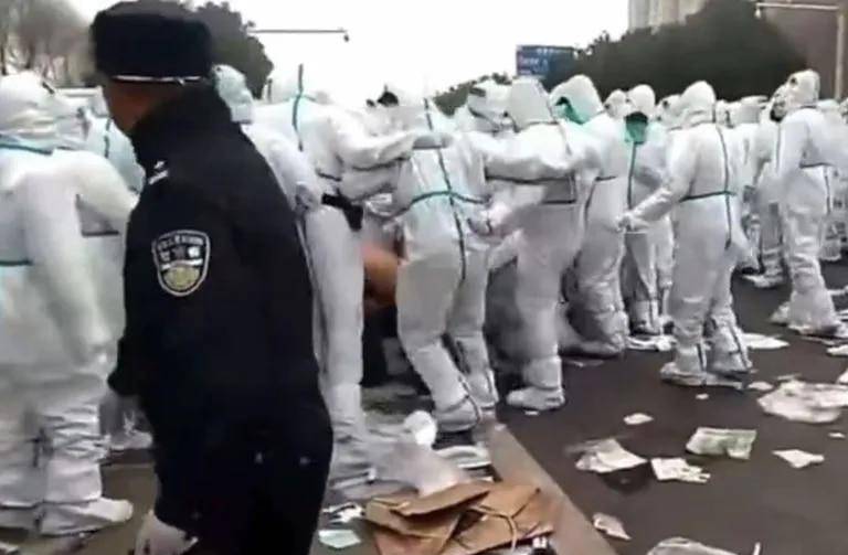 En otro vídeo se ve a decenas de personas vestidas con trajes de protección empuñando porras y persiguiendo a los empleados, uno de los cuales es derribado al suelo antes de parecer recibir una patada en la cabeza.
