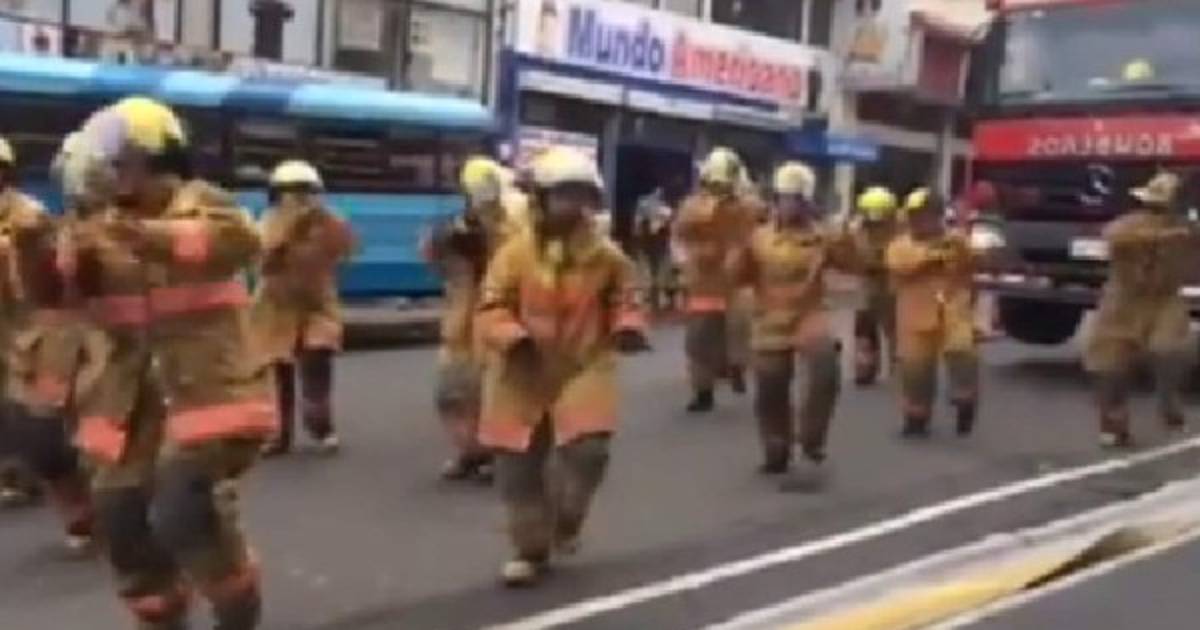 Más de 15 bomberos participaron en esta demostración de baile que paralizó una pequeña porción de la capital robándose la simpatía de quienes al pasar observaron el show según lo informó el portal crhoy.com