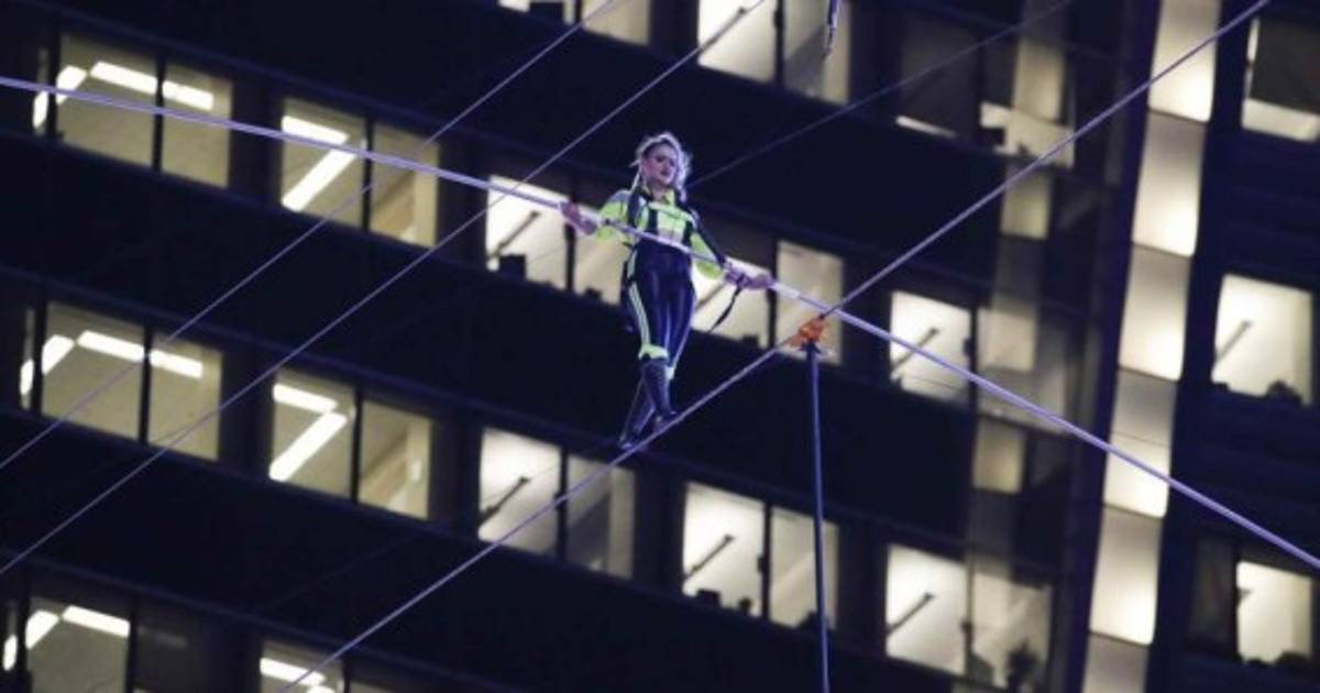 Para el cruce realizado a la altura del piso 25 de un rascacielos, los funambulistas salieron de ambos extremos del alambre con su balancín y se encontraron a medio camino, agregando más suspenso a su proeza equilibrista.