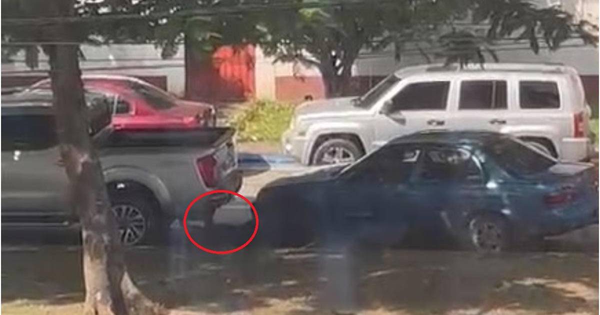 Dos hombres a bordo de un turismo sin placa fueron captados por un ciudadano mientras se robaban la llanta de repuesto de un pick-up que está estacionado.