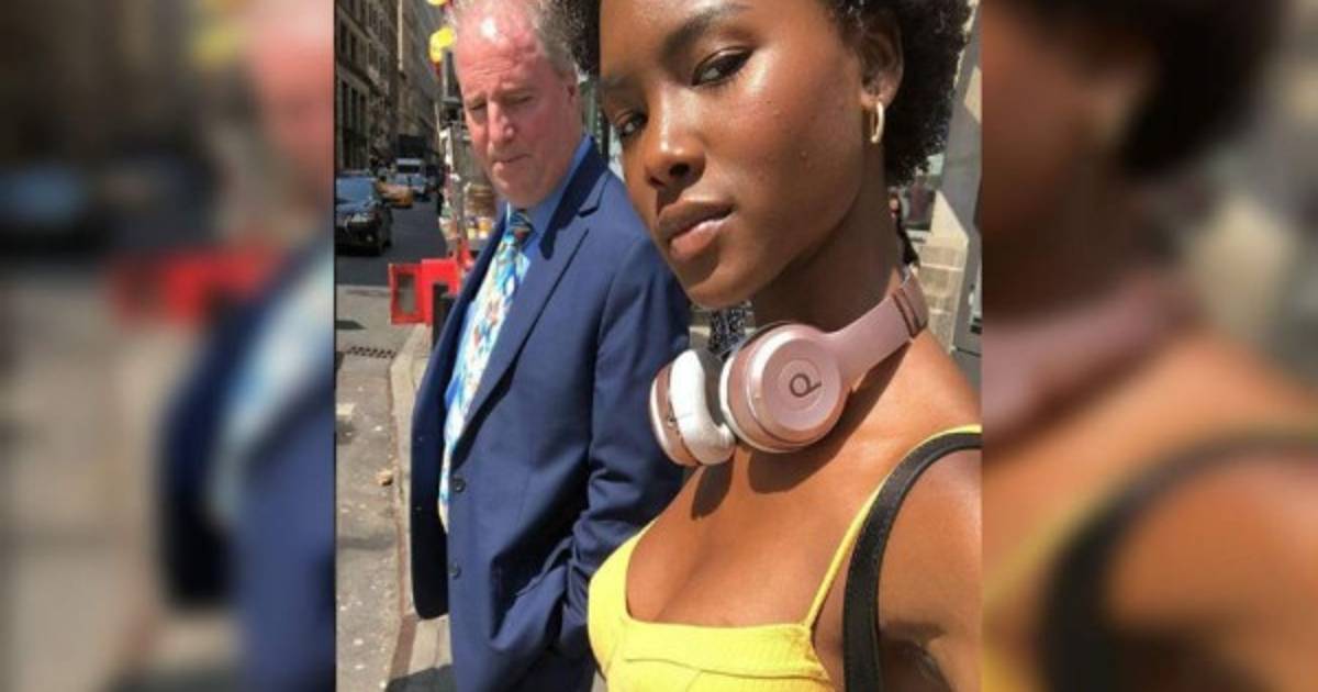 Todo empezó con la fotografía de una mujer que estaba esperando a cruzar la calle cuando ella se toma una selfie, pero sin imaginar que a su lado habría un hombre viendo su escote.
