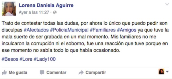 'Trato de contestar todas las dudas, por ahora lo único que puedo pedir son disculpas a los afectados, policía municipal, familiares y amigos ya que tuve la mala suerte de ser grabada en un mal momento' publico #Lady100pesos en su cuenta de Facebook.