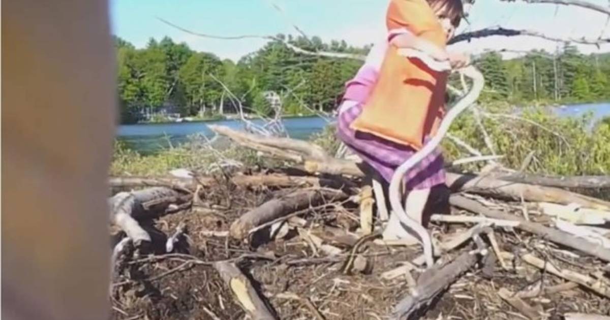 la pequeña recoge una serpiente con la mano y se ríe mientras que el reptil culebrea.