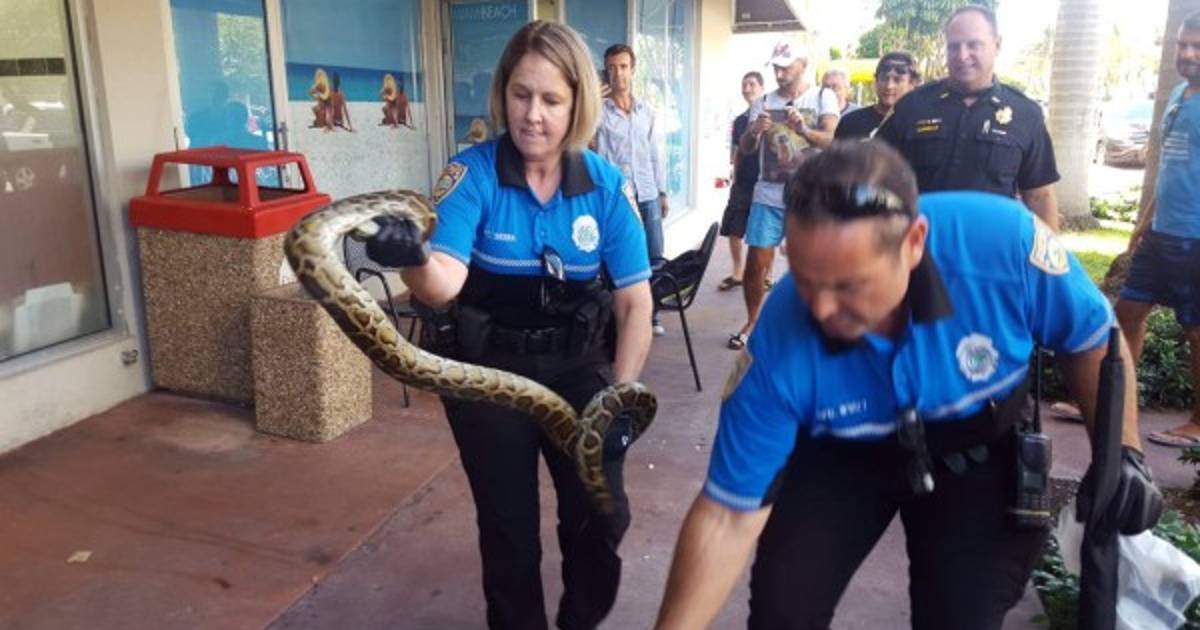 La policía de Miami Beach -un islote turístico frente a la costa de Miami, Florida- acudió a un llamado de emergencia y capturó a la pitón de Burma en un episodio que fue fotografiado y filmado, al parecer, por cuanto transeúnte con celular pasaba por allí.