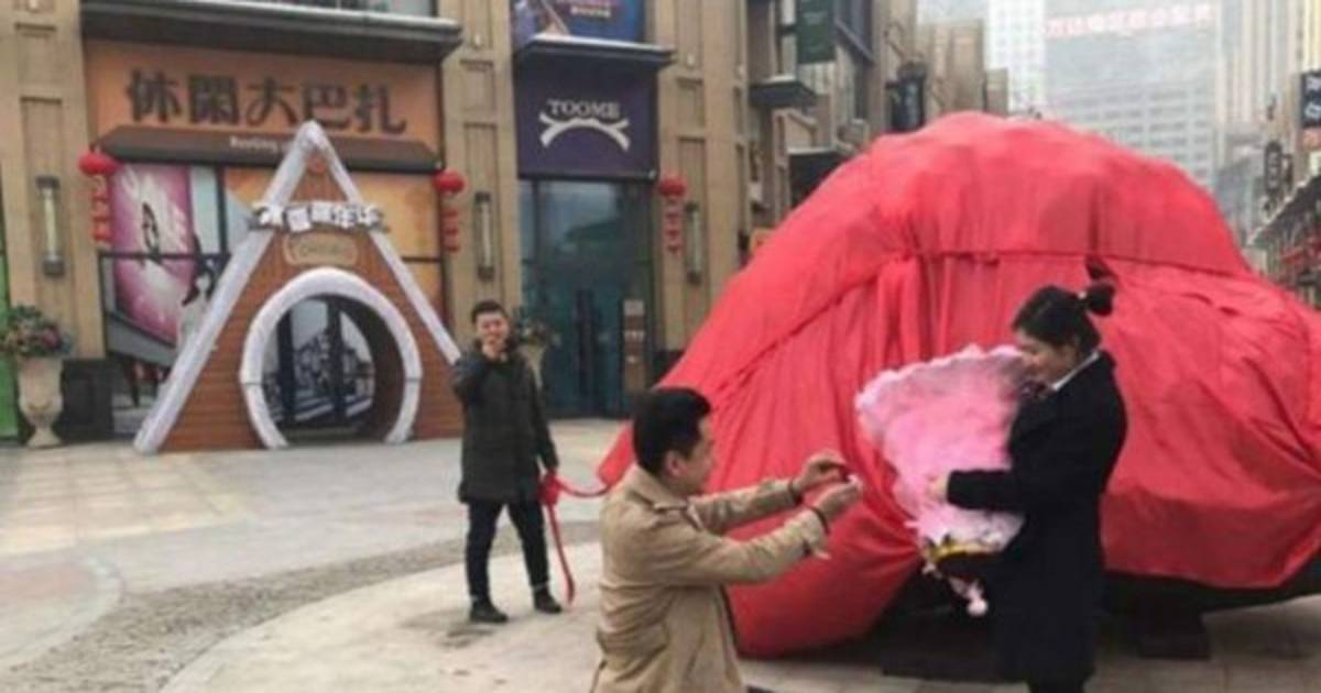 Liu Fei, el enamorado, organizó la pedida de mano en plena calle, donde la sorprendida novia, Wang Fangfang, no sólo recibió el consabido anillo de compromiso, sino también un corazón confeccionado con pétalos de rosa y una enorme piedra de 33.000 kilos envuelta en papel de regalo rojo.