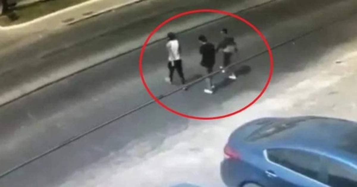 Las imágenes muestran a los supuestos delincuentos caminar tranquilamente por una calle y luego tratan de cruzar hacia una mediana cuando son embestidos brutalmente por un camión blanco.