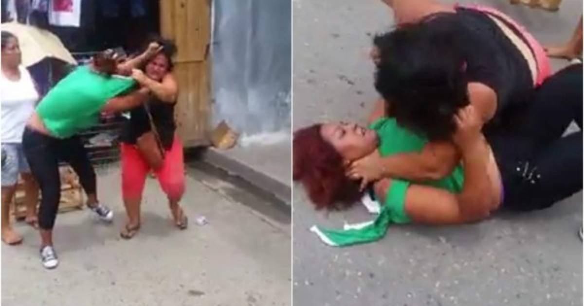 Tras ellas viene un hombre que trata de desapartarlas, intenta persuadirlas con palabras pero no lo logra, las mujeres sin avanzando por la calle agarrándose del pelo.