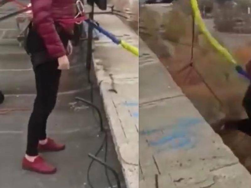 En la grabación se observa que la mujer se lanza al vacío desde la azotea de un hotel en Karagandá, confiada de que estaría sujeta.