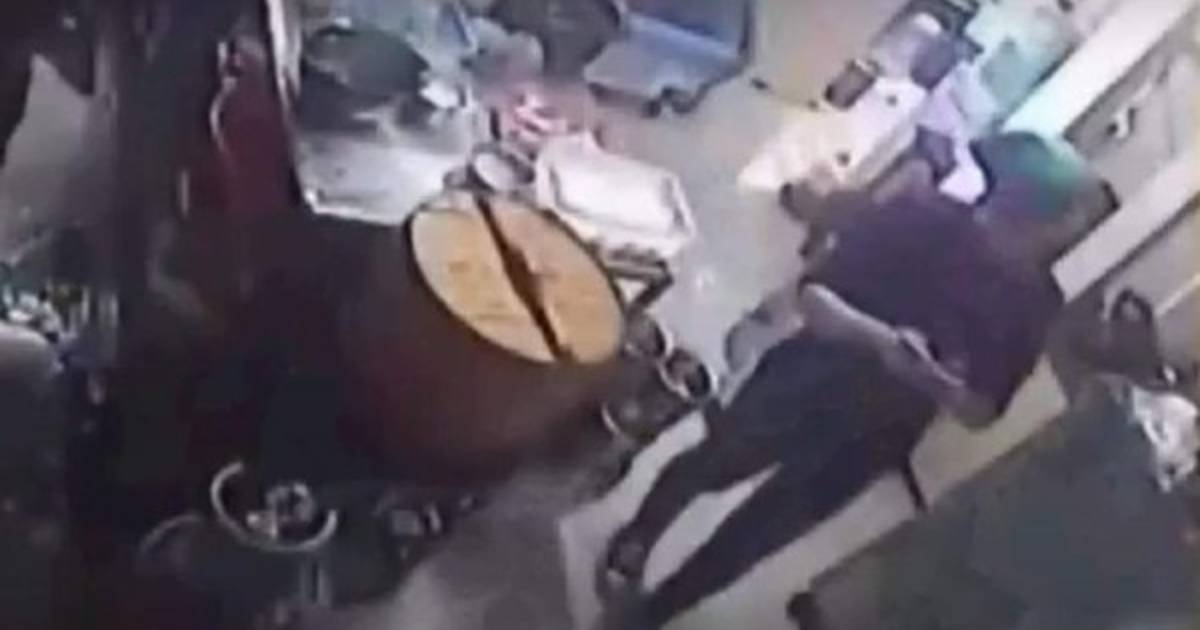 Las impactantes imágenes revelan que la mujer estaba regresando a la cocina del local cuando saca su teléfono y comienza a usarlo sin prestar atención a lo demás.