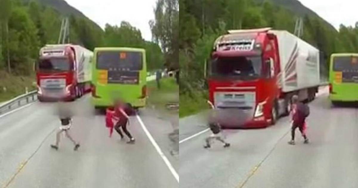 Un conductor grabó el aterrador momento en el que un niño queda a milímetros de ser arrollado por un camión en una carretera de Høyanger, Noruega.