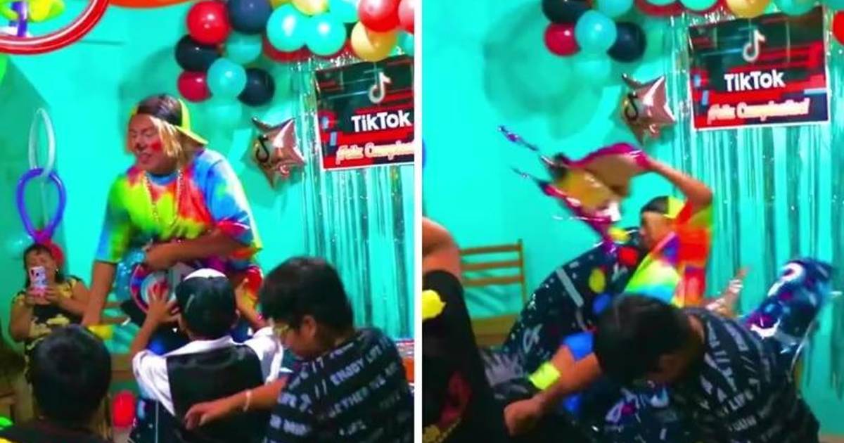 Un payaso se ha viralizado en redes sociales tras la caída encima de la torta del cumpleañero. El animador fue contratado para dar un show infantil, en un momento cuando estaba repartiendo las golosinas de la piñata, un niño lo empujó, perdió el equilibrio y terminó encima del pastel.