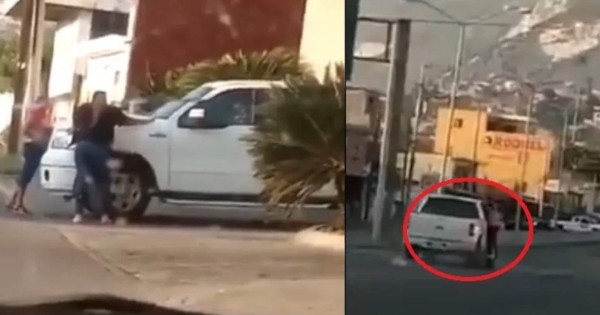 En las imágenes se observa a la mujer junto a un grupo de amigas obstruyendo el paso del hombre. Tras ‘encararlo’, la mujer se quita del medio, en ese momento el infiel aprovecha y sale a toda marcha, eso sí con una sorpresa en su lado derecho.