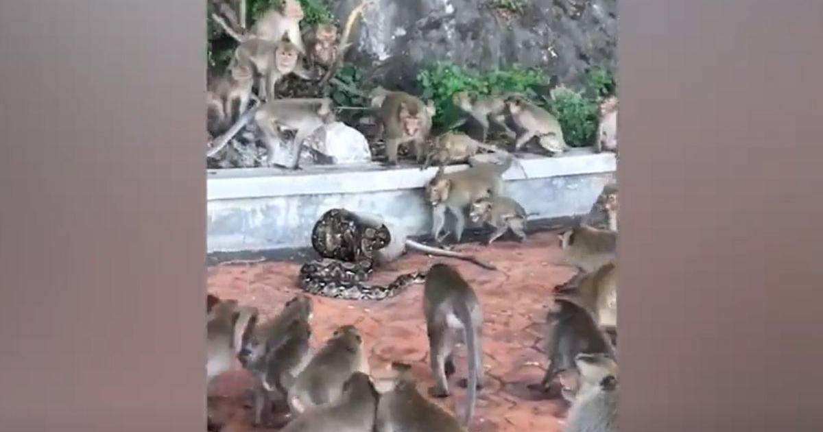 En el video, que data del 2019 se ha viralizado, y en él se observa el momento en que la pitón, de más de dos metros de largo, enrolló a un mono tratando de estrangularlo, mientras que decenas de primates la rodean y se acercan de forma cuidadosa, intentando salvar a su compañero.