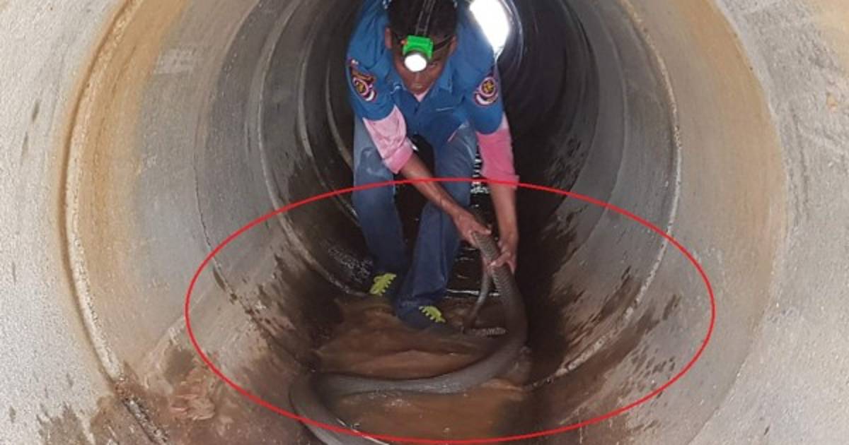 El video viral muestra la audaz captura y muestra a un hombre persiguiendo a la cobra --la serpiente venenosa más larga del mundo-- en un tubo de drenaje oscuro y estrecho.