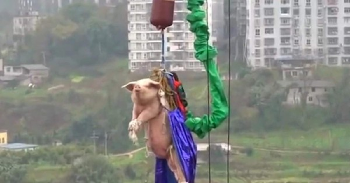 En el clip, se puede observar cuando llevan al animal amarrado de sus patas hasta el punto más alto del bungee jumping para luego lanzarlo. Esto recuerda al video de la semana pasada donde arrojan a otro porcino desde un helicóptero.
