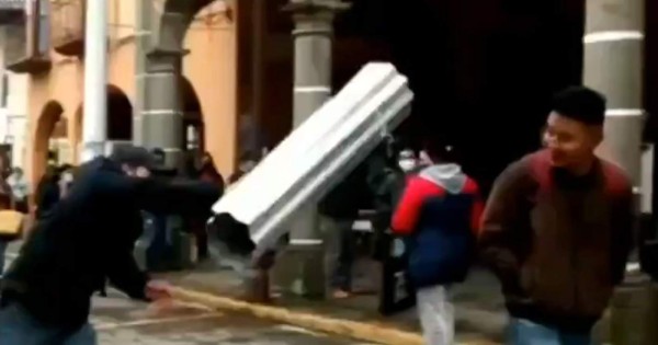 Las curiosas imágenes que fueron captadas en Huauchinango, Puebla, se observa cómo un grupo de comerciantes decidió lanzar láminas a las personas que no use el cubre boca; esto como medida para hacer conciencia y llamar a los vecinos redoblar esfuerzos para evitar la contagios.