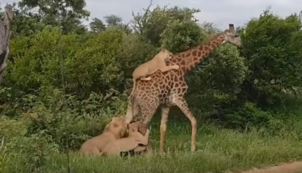 Varios turistas presenciaron el ataque de una manada de leones a una jirafa. En el enfrentamiento, una leona se trepó por el lomo de la jirafa solitaria en un intento por derribarla.