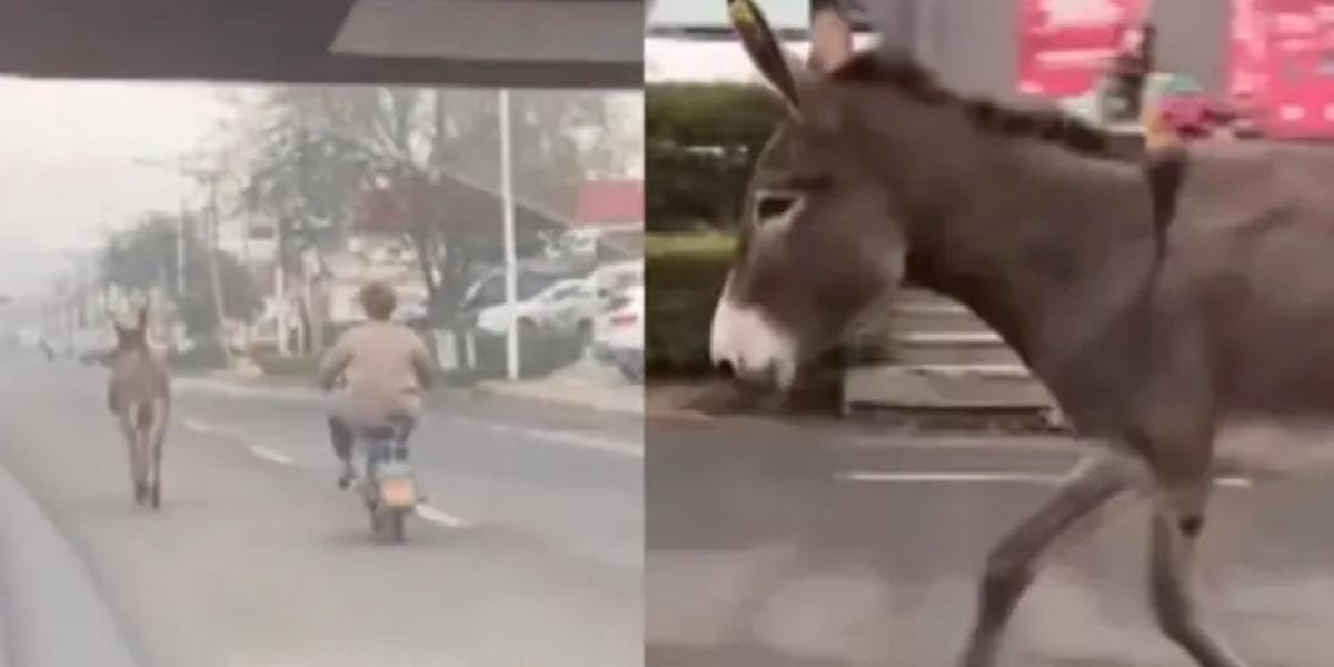 El burro iba corriendo a toda velocidad por mitad de la carretera, perseguido por empleados del restaurante del que había huido. Se desconoce cuál fue el destino final del escurridizo animalito.