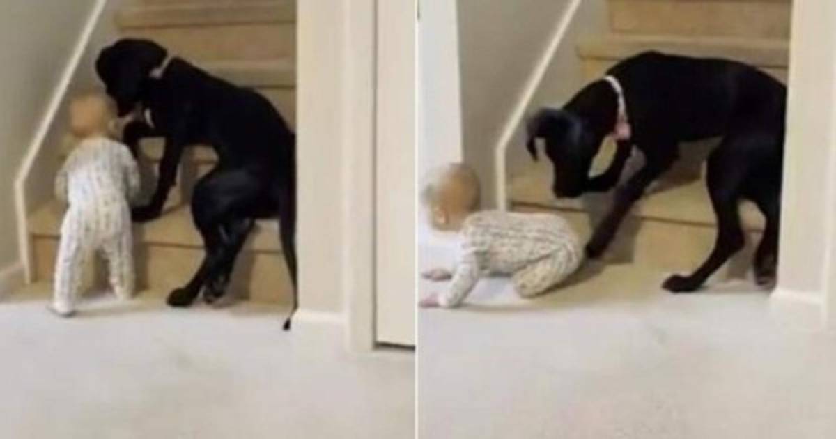 Una familia difundió el video viral de su perro en el momento en el que le impide al bebé que suba las escaleras de la casa.