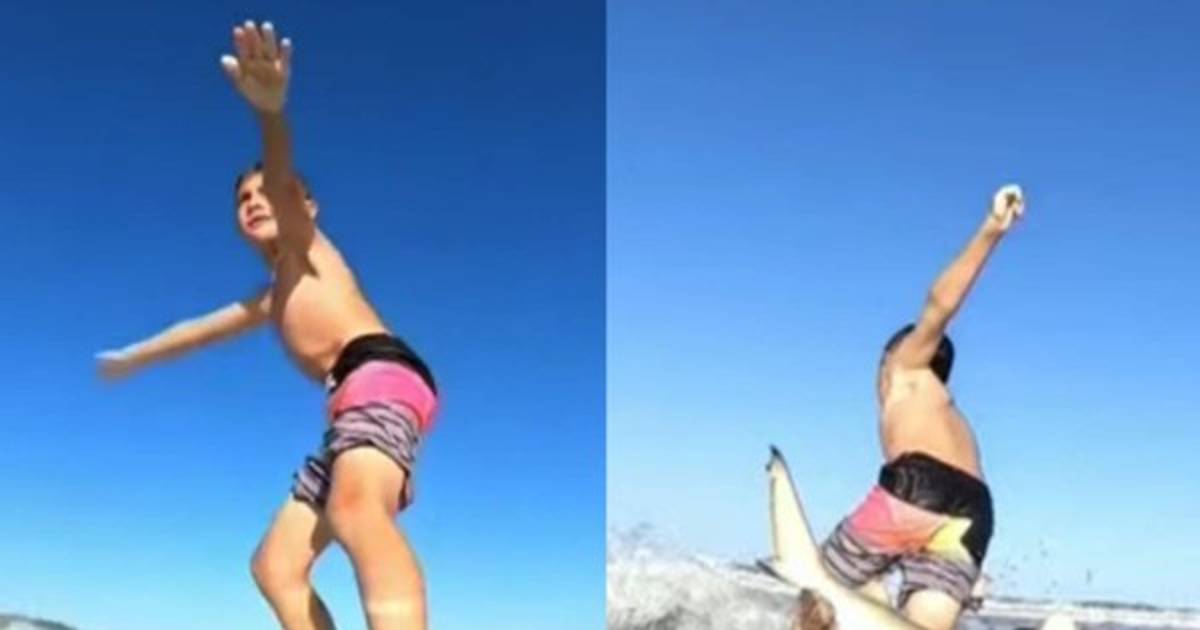 'El tiburón casi muerde a mi hijo en el agua, así que es un poco surrealista', indicó Shaun a varios medios de comunicación, quien al reproducir las imágenes en cámara lenta se da cuenta que sí era un tiburón el que hizo caer a su hijo de la tabla.