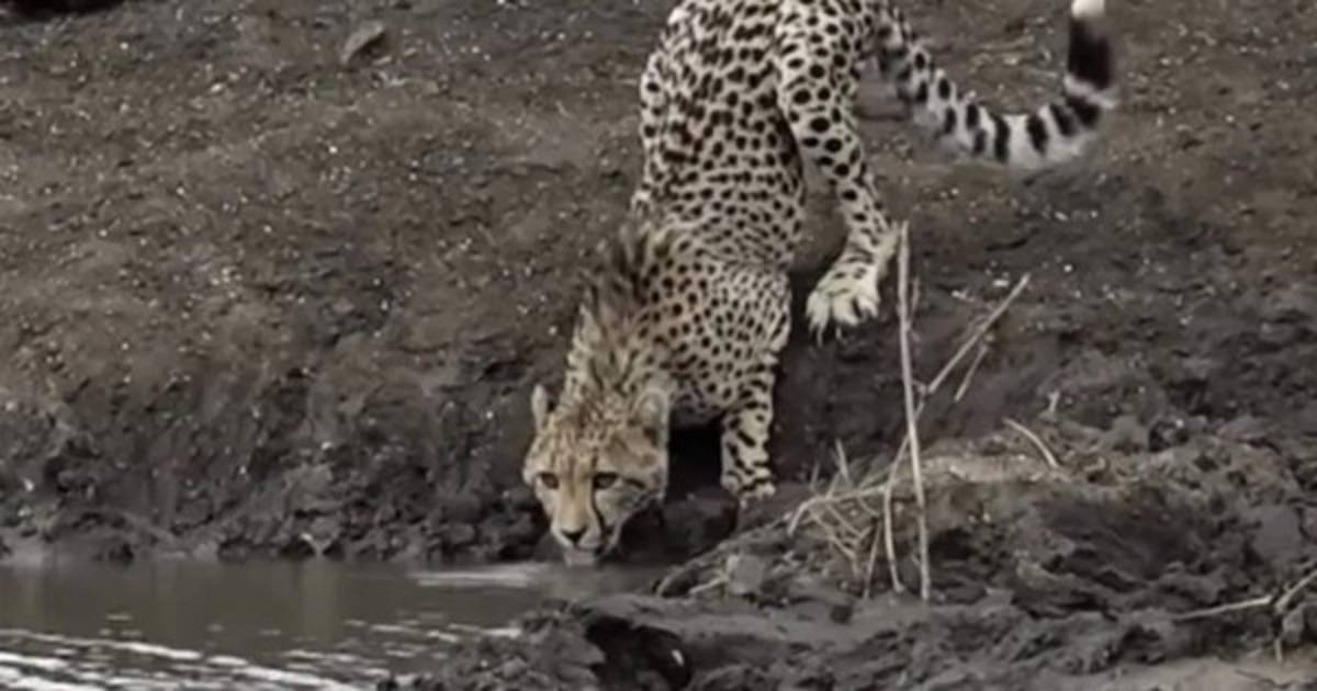 En las imágenes se puede ver que el chita, el animal terrestre más veloz, capaz de superar fácilmente los 100 kilómetros por hora, se acerca con cautela al agua para beber.