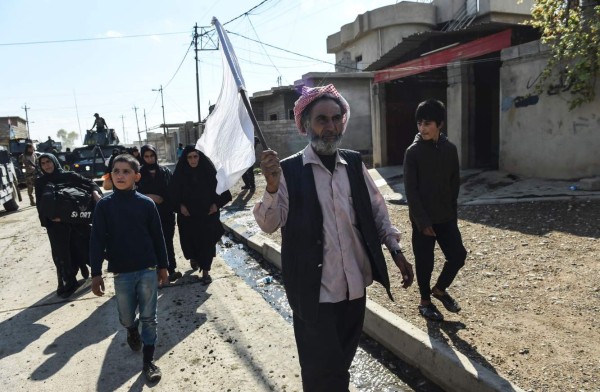Los civiles iraquíes huyen de la aldea de Gogjali. AFP