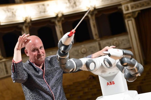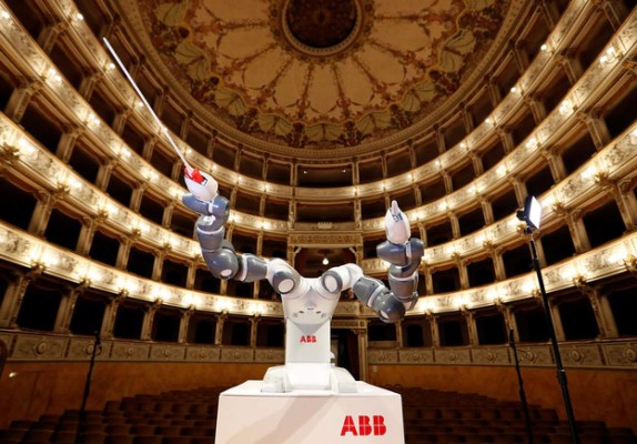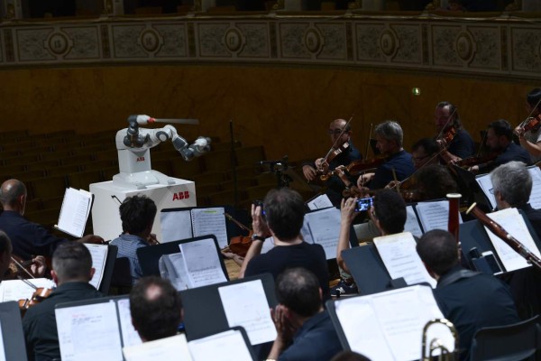 Diseñado en Suiza, el robot YuMi agita su batuta con una mano, mientras que la otra se mueve en el aire como una caricia, al son del aria “La Donna E’ Mobile” de Verdi.