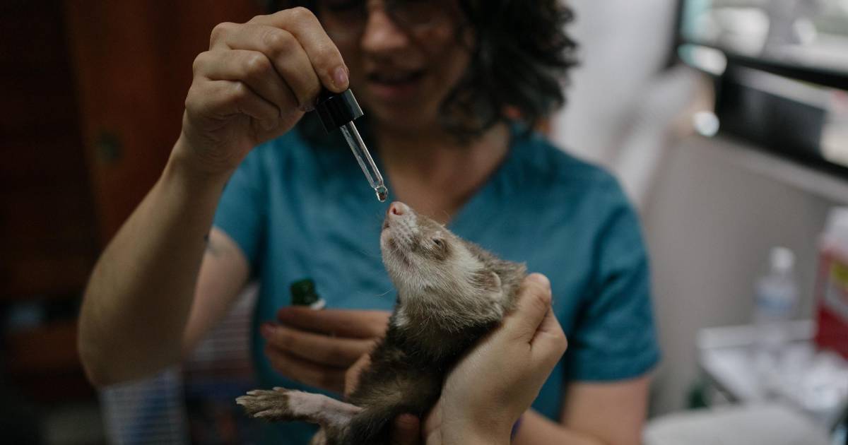Fenri, un hurón que sufre una enfermedad inflamatoria intestinal, recibe CBD en la Ciudad de México.