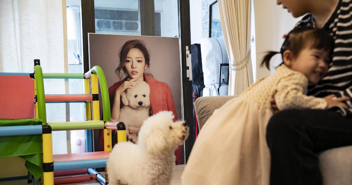 La sobrina y el perro de Goo Hara en la casa de su hermano. Al fondo, una foto de Goo, quien se suicidó.