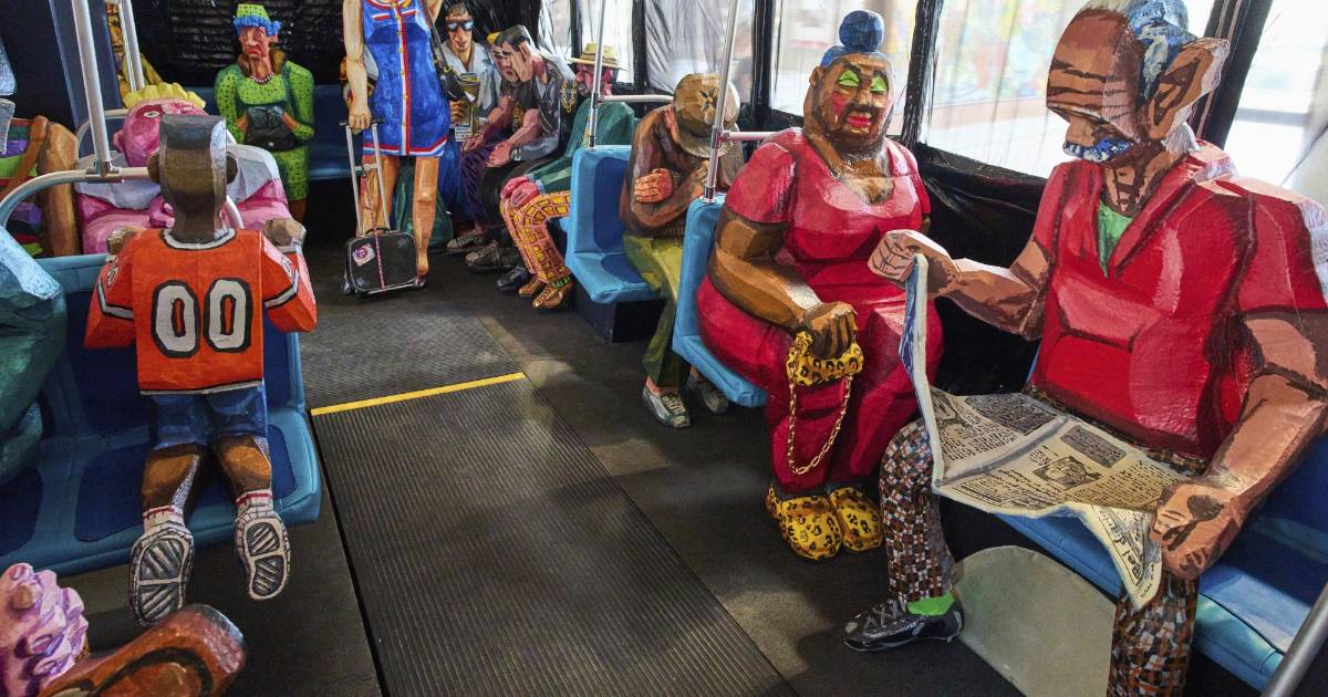 La escultura blanda de Grooms de 1995, “El Autobús”, una réplica en tela de un autobús neoyorquino, ocupa un lugar destacado en la sala central de exposiciones. Pijbes dijo que la obra simbolizaba los resultados positivos de una migración exitosa, mostrando “toda esta mezcla de personas que hacen de Nueva York Nueva York”.