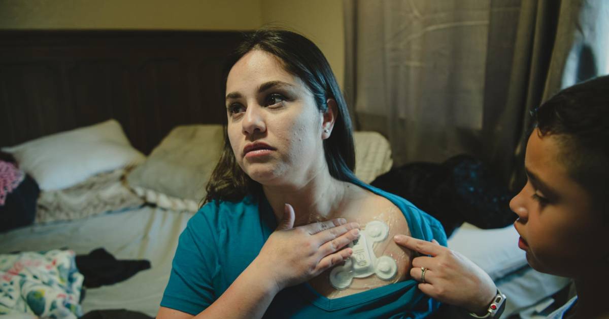 Marlene Rodríguez porta un biosensor que monitorea su corazón. “Estuvo enferma al max”, dijo su médico.