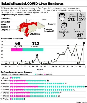 Ayer se elevó a 172 el número de pacientes, luego que se confirmaran 31 casos nuevos: 22 de Cortés, 4 de Colón, 2 de Francisco Morazán, 2 de Atlántida y 1 de Lempira. Cortés ya suma 102 contagiados.