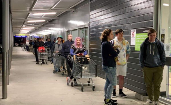 Los compradores esperan para entrar en un supermercado en el suburbio de Johnsonville en Wellington, Nueva Zelanda. Foto AFP