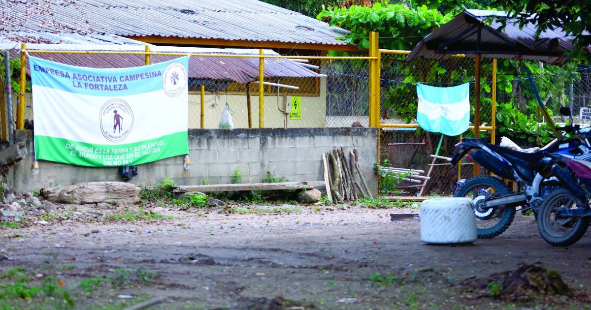 Las fincas invadidas están marcadas con la bandera de Honduras, mientras que adentro se observan hombres en motocicletas que andan cargando los camiones de fruta que cortan de la palma.