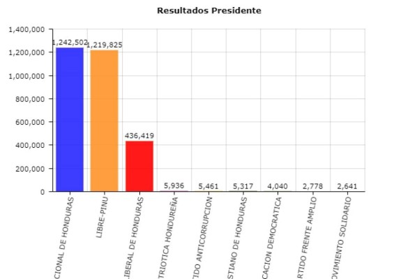 Nasralla obtenía 1,110,119 votos y Juan Orlando Hernández llegaba a 1,093,440 votos, dejando la diferencia establecida en solo 16,679 votos.