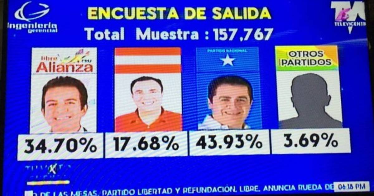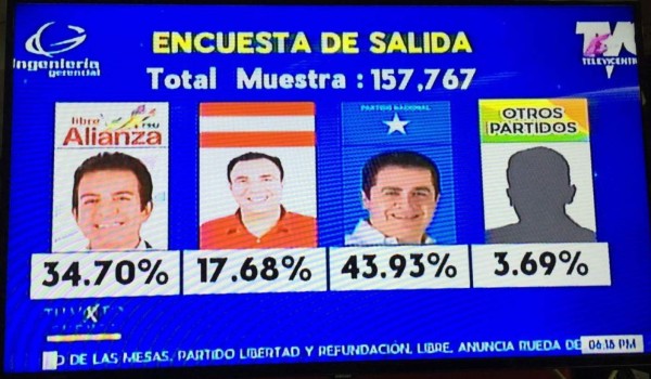 Los resultados a boca de urna el Partido Nacional (PN) obtuvo el 43.93%, la Alianza de Oposición, 34.70%, el Partido Liberal, 17.68% y las otras fuerzas políticas, 3.69%.