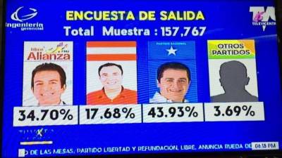 Estos resultados contrastan con las proyecciones de la encuesta a boca de urna realizada por la reconocida empresa auditora Ingeniería Gerencial que fueron divulgadas a las 7:00 de la noche del domingo y que daban por ganador a Juan Orlando Hernández.