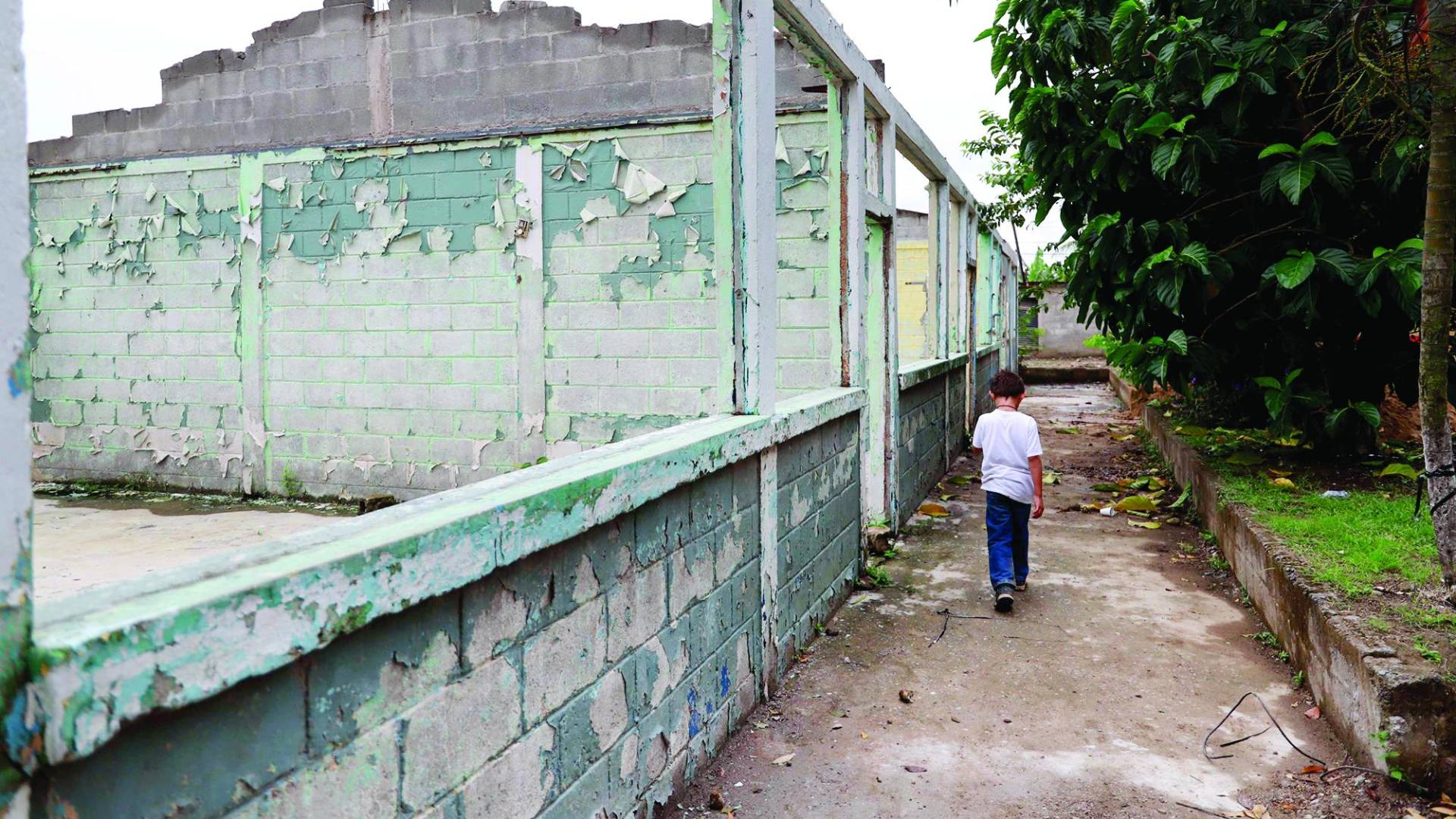 Esa escuela es la más grande de la zona, pero el panorama es alarmante. En medio de los alumnos hay perros que se ven enfermos, los menores caminan y hasta juegan en las ruinas de aulas que fueron azotadas por la fuerza del río Chamelecón.
