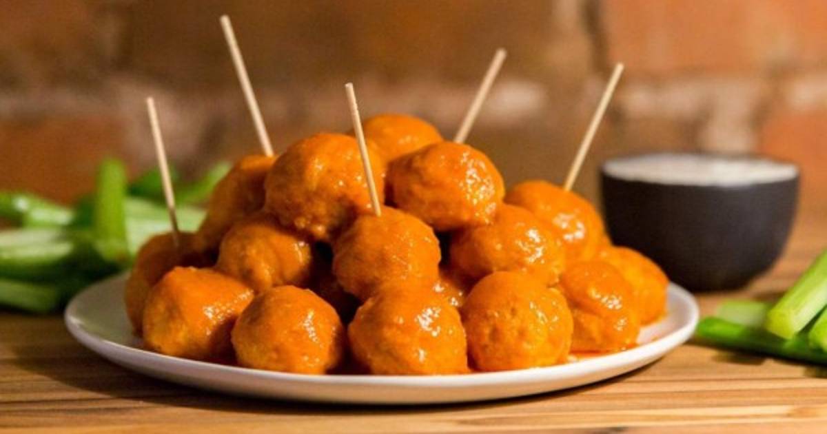 Retirar la charola del horno o del sartén y pasar las albóndigas a un plato o bol en el cual las va a servir y bañar con un poco más de su salsa búfalo que previamente separó.