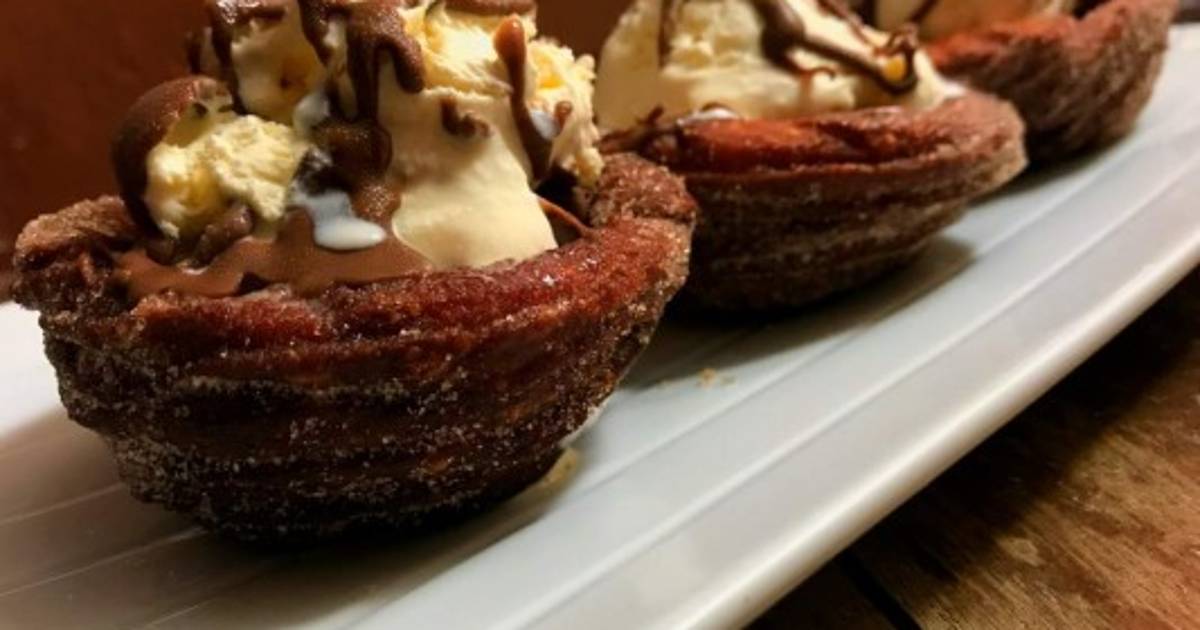 Freír las canastas en aceite bien caliente hasta que estén dorada y escurrir. Aparte combinar el azúcar granulada y la canela. Pasar las canastas por la mezcla de azúcar. Llenar con el chocolate derretido y una bola de helado.