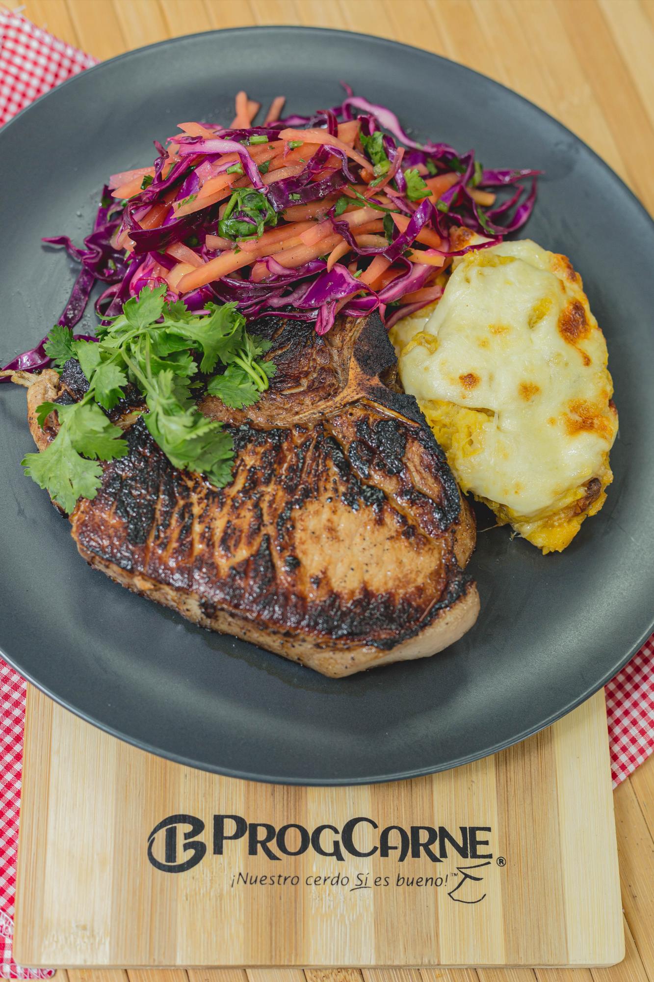 7. Servir las chuletas T-bone con un poco de ensalada de repollo y papaya junto a una porción de puré de plátano.