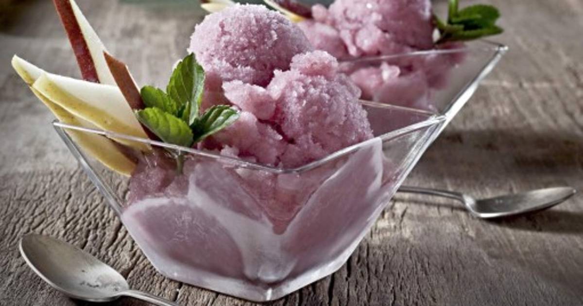 Hervir en una olla el vino con el agua y el azúcar; agregar las peras y dejar cocer por 10 minutos. Añadir jugo de limón y una pizca de sal; retirar del calor y dejar enfriar perfectamente. Vaciar en un recipiente, cubrir con plástico de cocina y congelar por cuatro horas. Servir con hojas de menta.