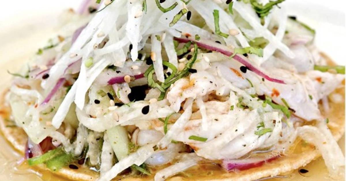 Dejar marinar camarón durante 15 minutos con limón, orégano, pimienta, jengibre y aceite de oliva. Incorporar el resto de ingredientes y mezclar. Servir en tostadas y decorar con ajonjolí tostado y cilantro.