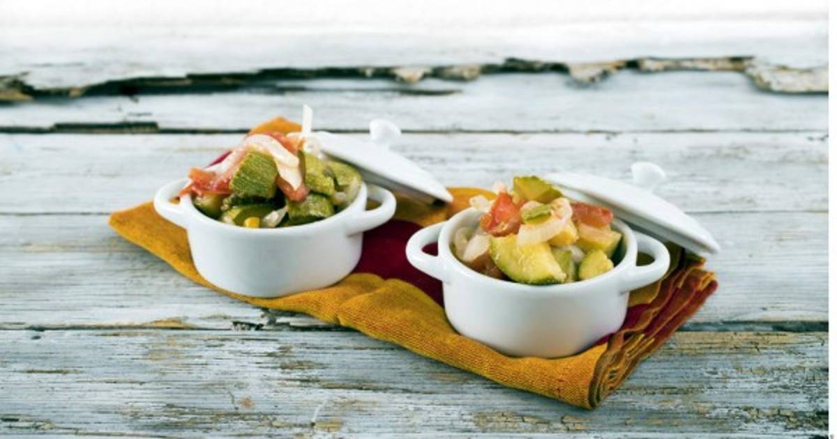Calentar la mantequilla y el aceite. Saltear el ajo y la cebolla, agregar la calabacita y el tomate. Saltear y sazonar. Dejar enfriar y servir.