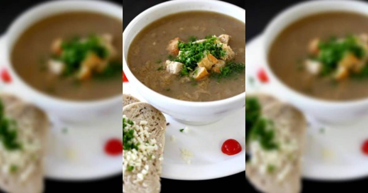 Servir la sopa en un tazón y colocar encima unas rebanadas de pan tostado y queso, llevar al horno a 220°C y dejar gratinar hasta que tome un color dorado.