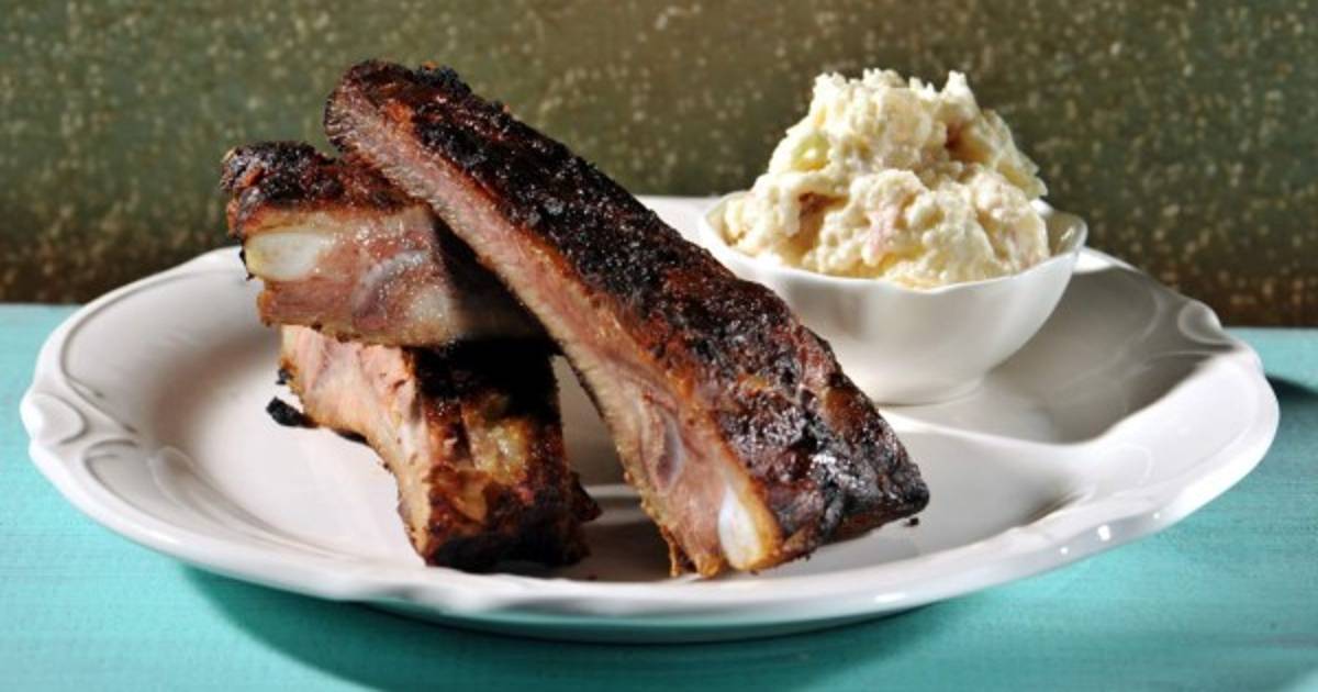 Para la ensalada mezclar el repollo, papa, mayonesa, mantequilla y salpimentar. Servir las costillas partidas con la ensalada.