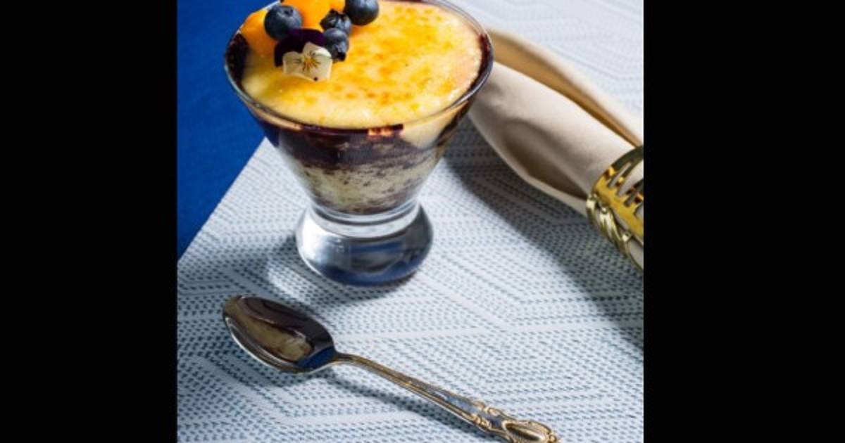 Espolvorear azúcar en la superficie de las cremas. Caramelizar con un soplete o con el dorso de una cuchara muy caliente. Decorar con mango y arándanos.