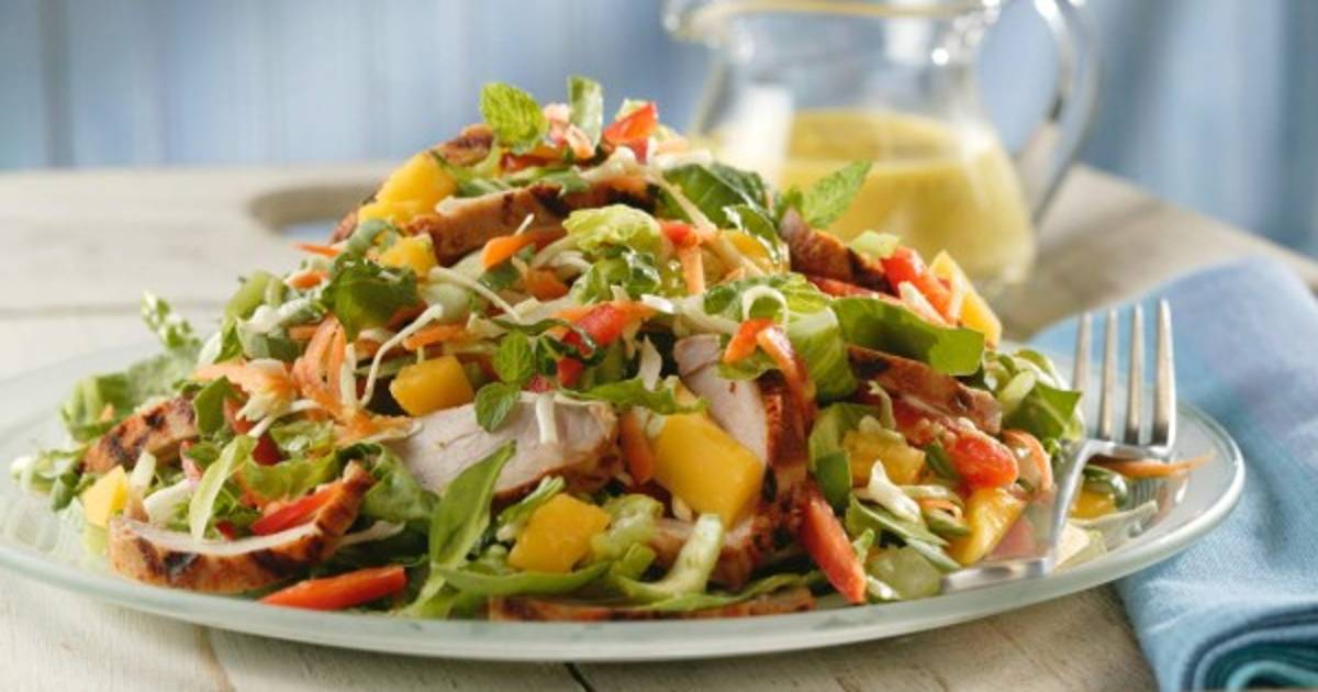 En un recipiente coloque la mezcla de lechuga con vegetales, las pechugas de pollo asadas cortadas en tiras largas, revuelva y espolvoree con el queso. Al momento de servir, añada a la ensalada el aderezo de mango.